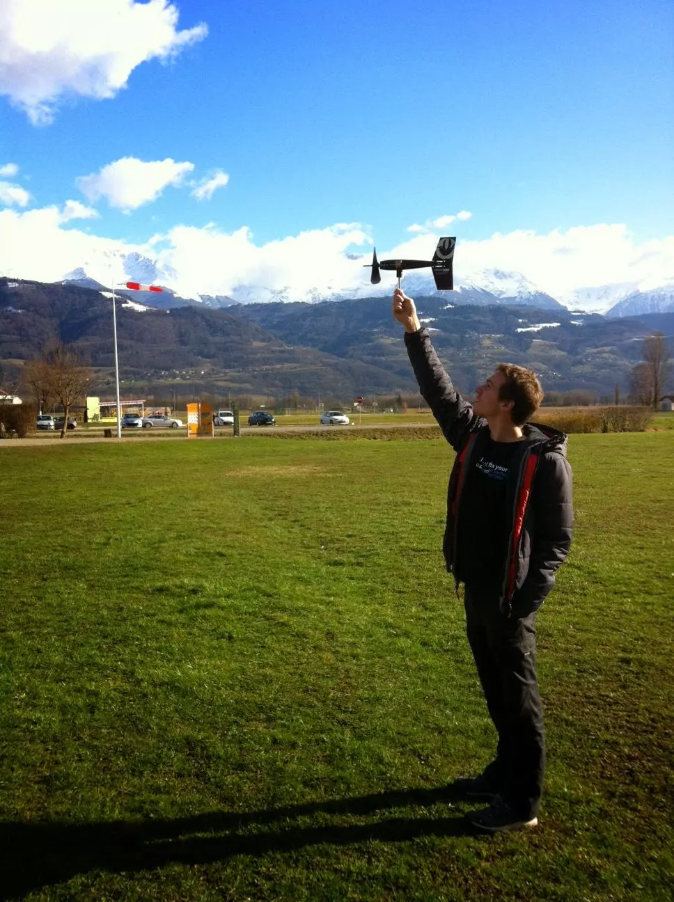 Les normes « Organisation Météo Mondiale » disent qu'il faut mesurer le vent à 10m du sol. Mais honnêtement, pour nous, un vieux mat de planche à voile genre 4m60 en fibre de verre fait très bien l'affaire.